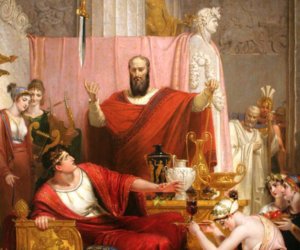 Megparancsolta, hogy vékony lószőrszárra akasztva lógassanak a mennyezetről egy kardot Damoklész feje fölé, hadd tegye csillogásával még fényesebbé boldog pillanatait.
